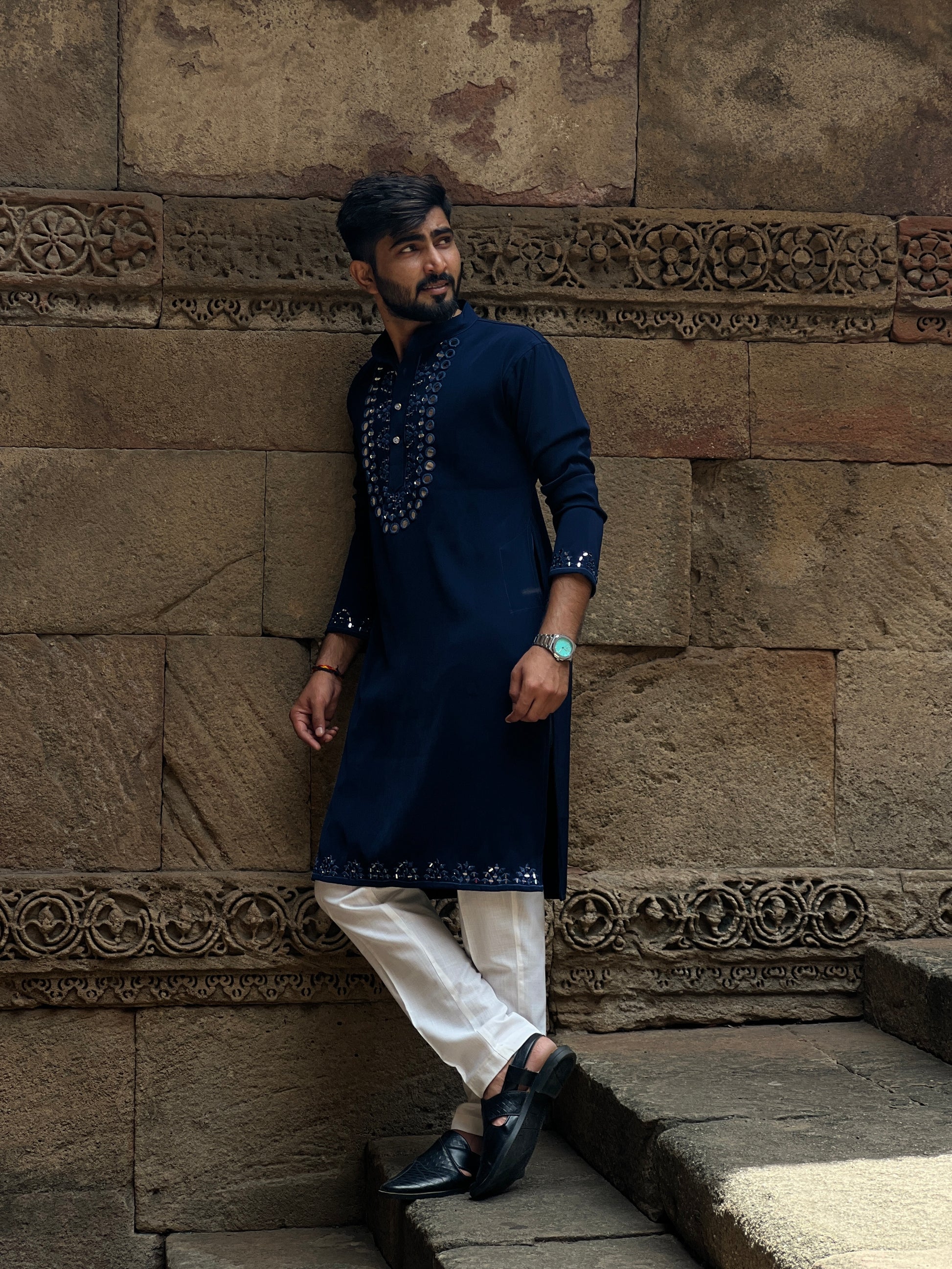 Step into elegance with this royal blue kurta from Aarambh. Made with premium cotton silk blend, this kurta is perfect for weddings, festivals, and traditional functions. Its classic silhouette and fine detailing bring out a rich, cultural vibe — tailored for the modern man.